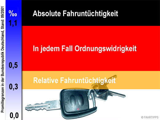 Seit dem 1.4.2001 hat die zuvor angewendete 0,8 Promille-Grenze keine rechtliche Bedeutung mehr. Stattdessen gilt nun der Grenzwert 0,5 ‰: Wer mit einer Blutalkoholkonzentration von 0,5 Promille unterwegs ist (oder eine Alkoholmenge getrunken hat, die später zu einem